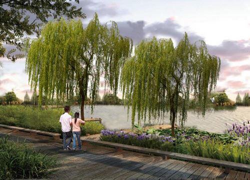 依托現(xiàn)狀地形地貌,打造親水平臺(tái),結(jié)合用地規(guī)劃打造條狀小游園。
